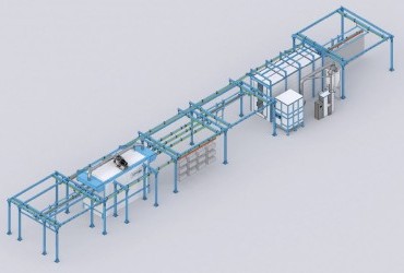 Двусторонняя камера нанесения порошкового покрытия (габариты — 7600 х 2600 х 4100 мм): предназначена для нанесения порошковой краски на изделия. Внутри камеры реализован сбор и переработка остатков неосевшей краски, что исключает их попадание в производственную зону и обеспечивает возврат порошка в цикл. Оснащена системой фильтрации и очистки воздуха, позволяющей возвращать очищенный воздух в помещение цеха.