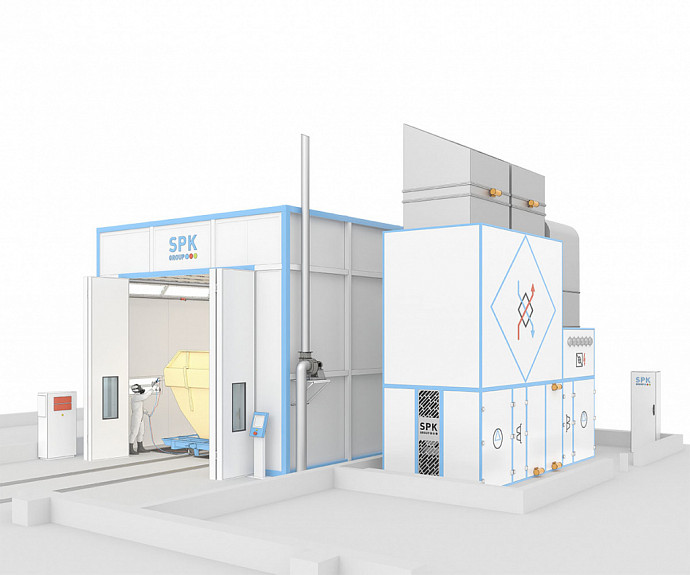 Окрасочно-сушильная камера тупикового типа SPK-SCB-10.6.5 (далее — ОСК) предназначена для подготовки изделий к покраске, нанесения на них лакокрасочных покрытий и их сушки при повышенной температуре. В камере обеспечивается равномерный поток очищенного, подогретого воздуха. Направление потока воздуха — сверху вниз камеры. Камера имеет сухой способ фильтрации воздуха от остатков краски. Это обеспечивает наилучшее нанесение лакокрасочного материала на подготовленное изделие и не требует реализации дополнительных очистных сооружений.